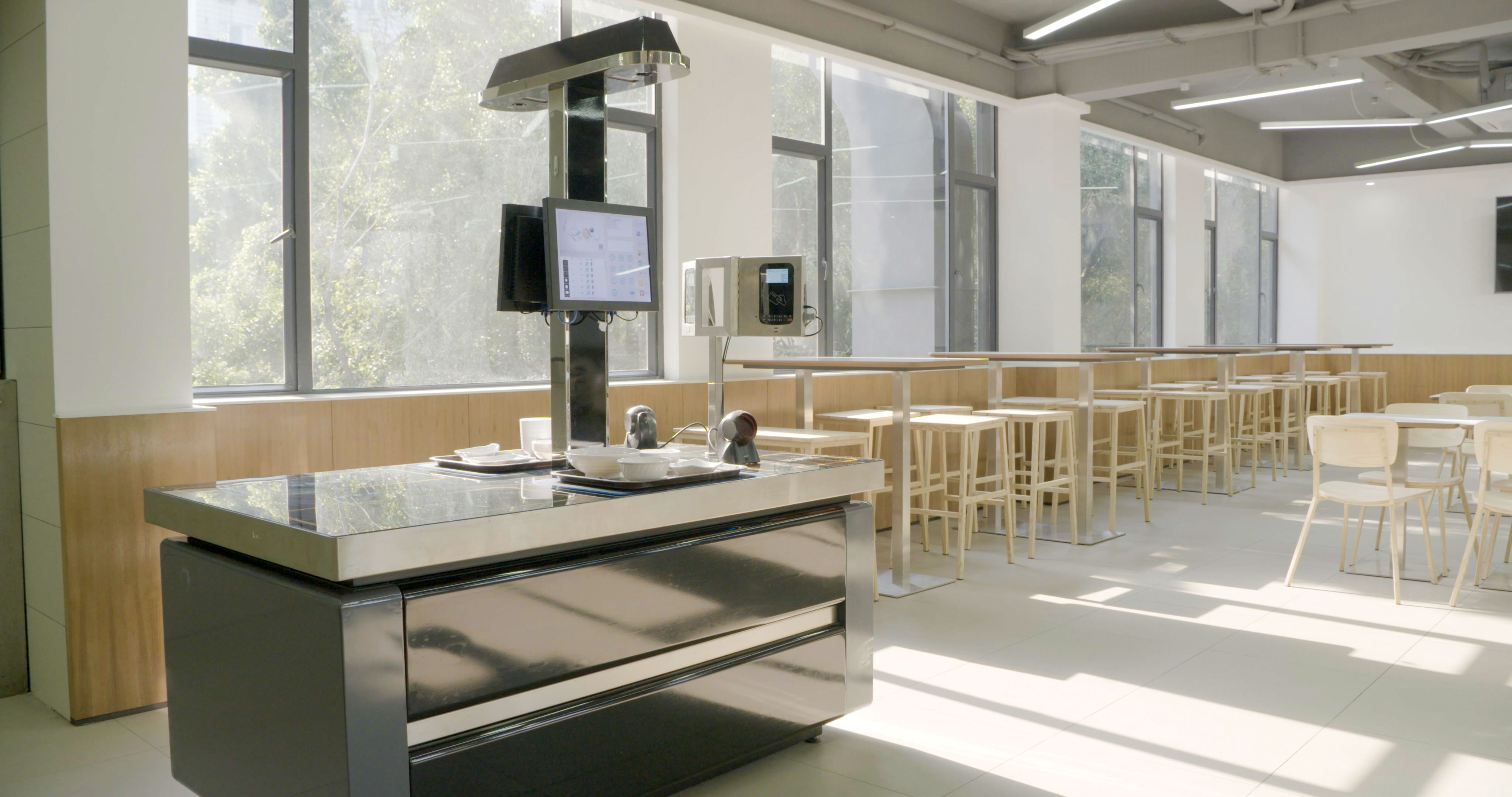 溢達(dá)集團(tuán)廣東紡織生產(chǎn)基地位于佛山高明區(qū),作為溢達(dá)最大的生產(chǎn)基地之一,該生產(chǎn)基地超過2萬員工,包括總廠和幾家分廠。其中總廠食堂超過1萬員工就餐,總廠食堂根據(jù)員工需求分為普通食堂、素食食堂、包間、自選食堂等多種業(yè)態(tài)模式,其中自選食堂定位為白領(lǐng)高端餐廳,為此特意準(zhǔn)備打造出充滿黑科技?xì)庀⒌闹腔鄄蛷d!