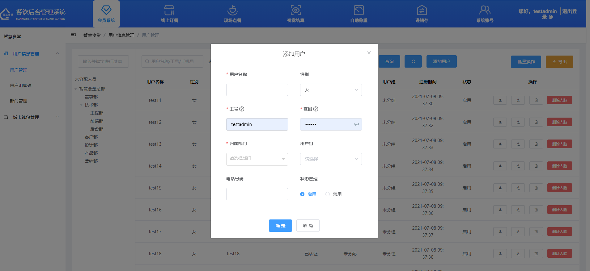 ①點擊“添加用戶”卡片,彈窗添加用戶名稱、工號、電話號碼、性別、歸屬部門、用戶組、密碼信息,可設(shè)置用戶狀態(tài)啟用或禁用,當(dāng)設(shè)置啟用是正常使用,設(shè)置禁用時用戶無法進(jìn)行登陸,可批量用戶導(dǎo)入;