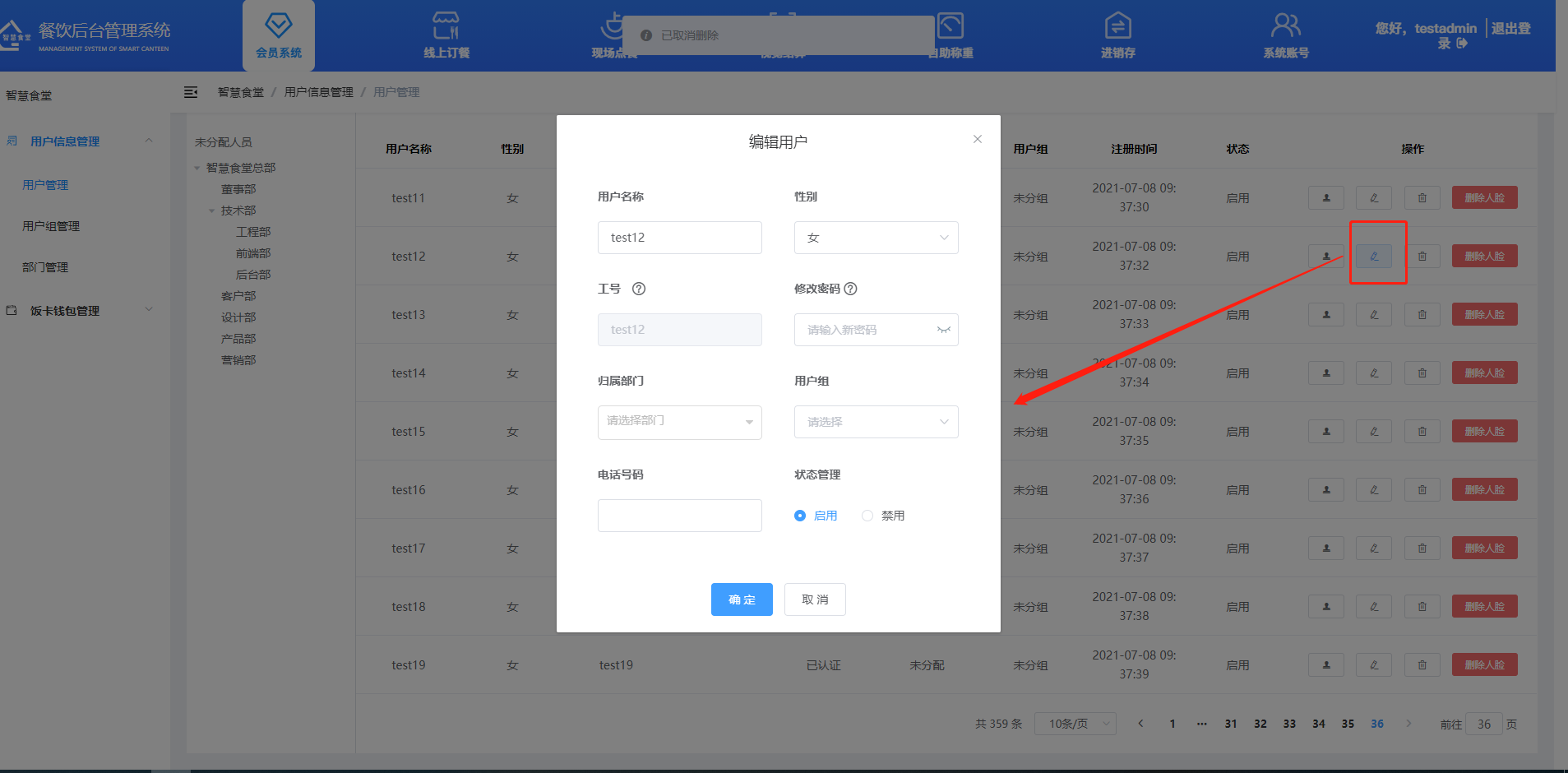 ⑤點擊右側(cè)操作畫筆小圖標(biāo)進(jìn)行用戶編輯,可以修改用戶名、電話號碼、性別、歸屬部門、用戶組、密碼、狀態(tài)管理等信息;