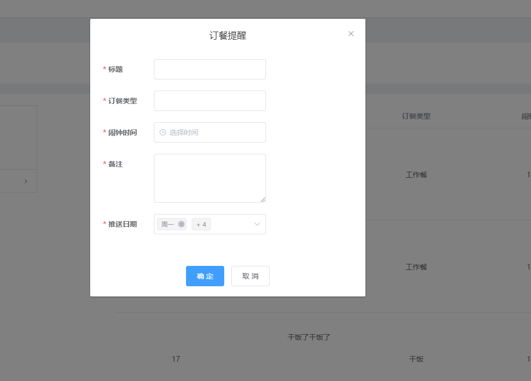 ①點(diǎn)擊“添加”按鈕添加標(biāo)題、訂餐、類型、鬧鐘時(shí)間、設(shè)置推送日期等信息;
