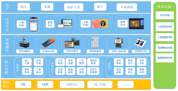 構(gòu)建醫(yī)患健康服務(wù)、病患就餐指導(dǎo)服務(wù)、禁忌餐食防控、數(shù)字化訂餐服務(wù)、區(qū)域堂食自助就餐等多種后勤餐飲全程閉環(huán)管理,實(shí)現(xiàn)數(shù)字化改革融合與創(chuàng)新。